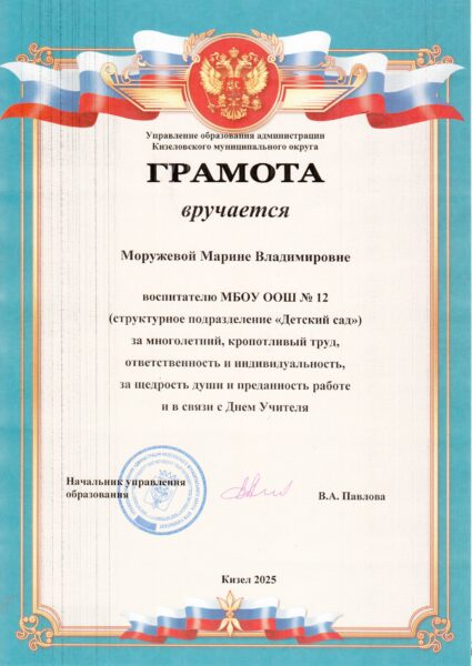 - 2014 г. — Почетная грамота от Министерства образования и науки Пермского края, за достигнутые успехи в воспитании, организации и совершенствовании физического развития детей дошкольного возраста, многолетний и добросовестный труд работников дошкольных образовательных учреждений.