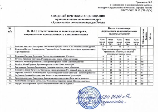 - Муниципальный заочный конкурс «Аудиосказка» (по сказкам народов России) среди родителей (законных представителей) воспитанников, детей и воспитателей детских садов Кизеловского муниципального округа с 24 февраля 2025 г. до 21 марта 2025 г. Положение (PDF) Сводный протокол.